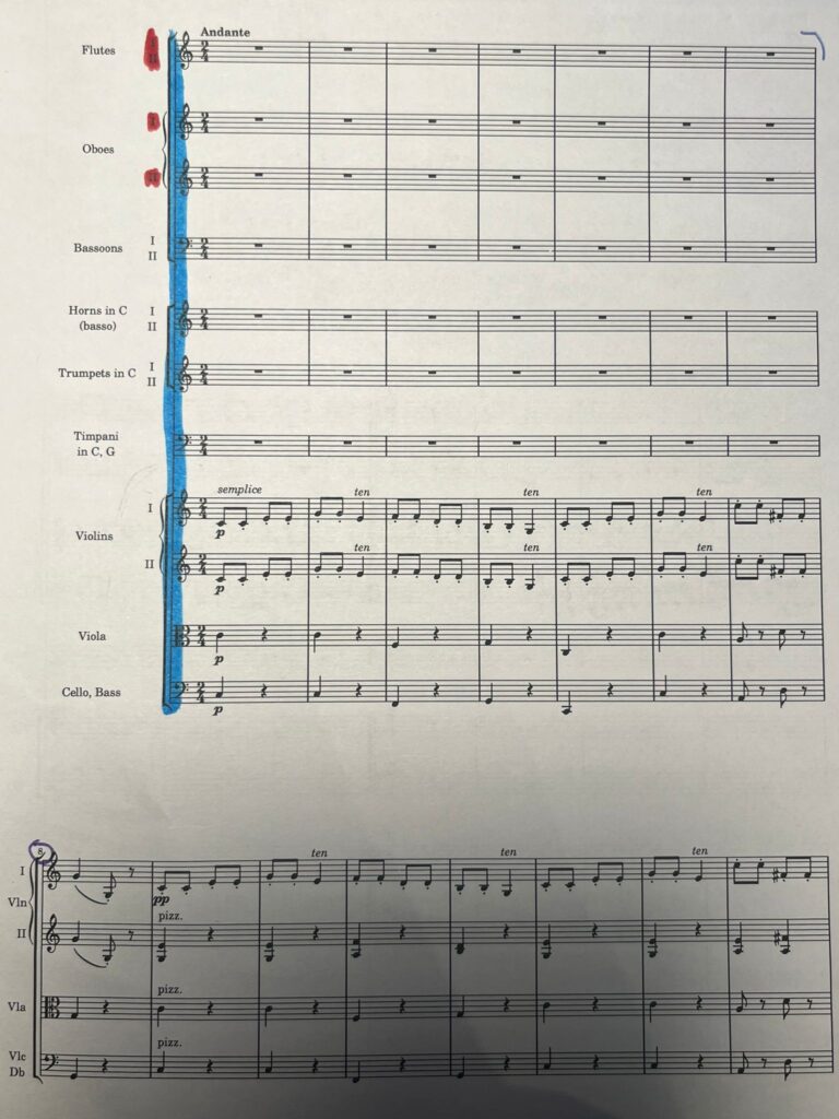Was ist eigentlich eine Partitur? Genau mit dieser Frage beschäftigen wir uns hier. Grob gesagt ist eine Partitur eine Gesamtübersicht über die Noten und Instrumente in einem Orchester. Genaueres erkläre ich nun hier anhand der Partitur des Stückes „Die Sinfonie mit dem Paukenschlag“. Auf dem Foto unter diesem Text sieht man die ersten 16 Takte dieser Partitur. Ein Takt geht bis zu einem Taktstrich in den Noten. Alles was blau markiert ist, wird gleichzeitig gespielt. Auch wenn am Anfang viele Instrumente Pause haben, sind sie aufgeführt, damit der Dirigent sieht, welche Instrumente alles im gesamten Stück mitspielen werden. Ab Takt 8 sind dann wirklich nur noch die Instrumente aufgeführt, die dort auch spielen. Man ließt die Partitur ganz normal von links nach rechts. In den ersten Takten sieht man ,dass dort bei manchen Instrumenten eine 1 oder 2 steht (rot markiert). Diese sind dort, da es bei manchen Instrumenten zwei Stimmen gibt. Das heißt, es sind die selben Instrumente, doch sie spielen etwas unterschiedliches.Neben den Noten sieht man welche Noten, zu welchen Instrumente gehören (z.B. erste Zeile Flöten). Ich hoffe, ihr konntet einen kleinen Einblick in eine Partitur bekommen. (Geschrieben von Finja)