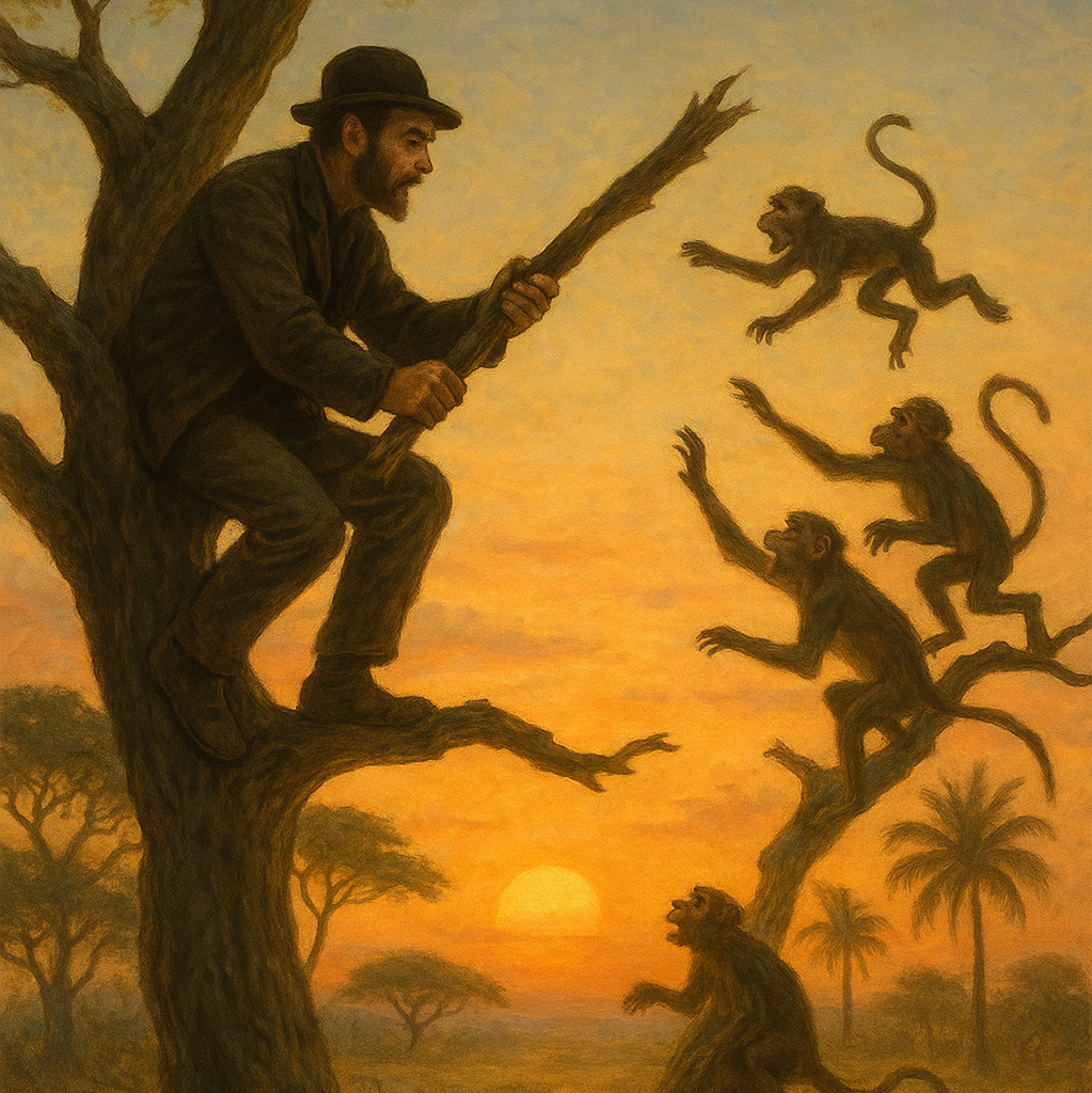 ,,Morgendämmerung.Akazien und Palmen.Peer-Gynt sitzt in seinem Baum und wehrt mit einem abgerissenen Ast eine Gruppe Affen ab“.